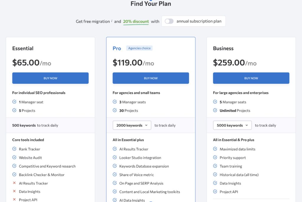 SE Ranking offers three main plans: the Essential plan starts at $65 per month, the Pro plan is $119 per month, and the Business plan costs $259 per month. You can save 20% with annual billing, and every plan comes with a 14-day free trial.